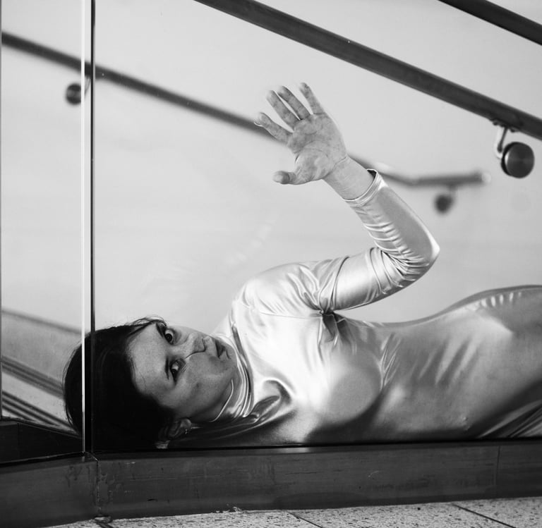 My self-concealment in my photographs underscores the discomfort and unease I feel within the world around me. Within industrial spaces, I reclaim territory in a man-made environment, a way of protecting myself while confronting the structures that overwhelm me. I center the zipper of my silver bodysuit as a small act of performance, highlighting how women’s clothing frequently prioritizes appearance over autonomy. Rather than being sexualized, I merge with the industrial forms and architecture around me. The restrictive nature of women’s fashion mirrors the broader lack of women’s agency in male-dominated spaces.